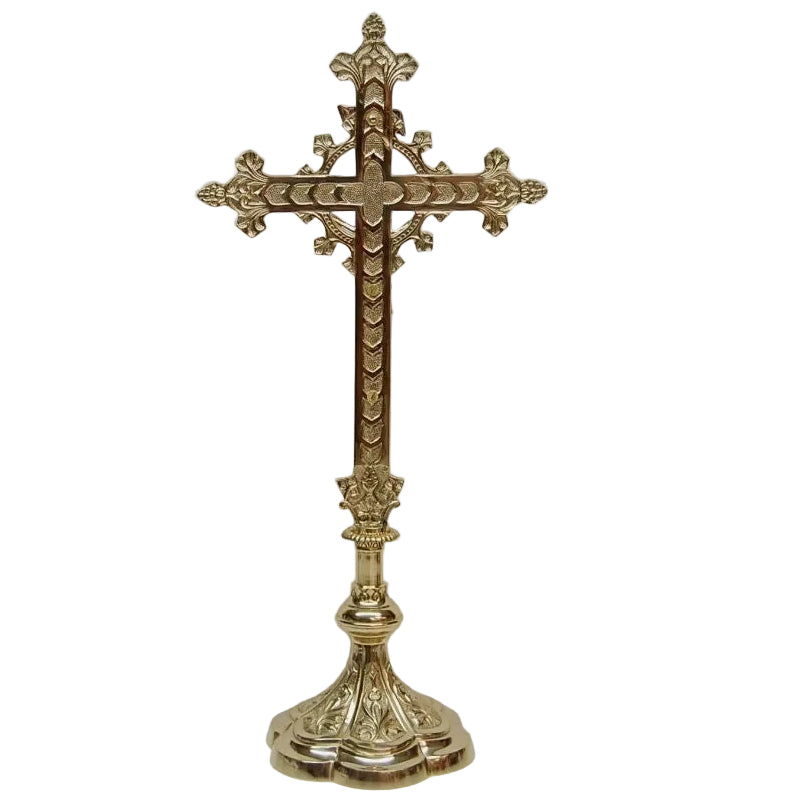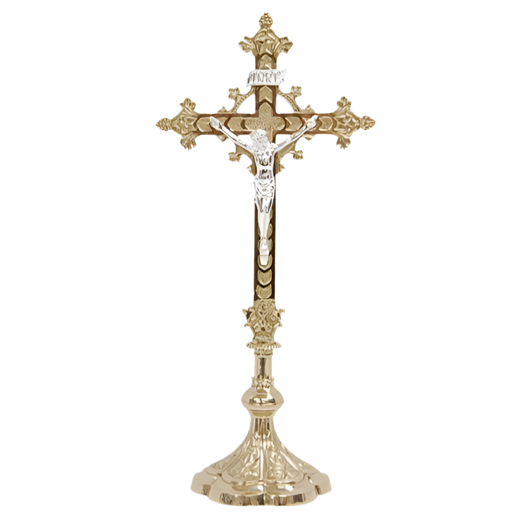 Traditional Altar Cross. Solid brass, polished and lacquered. Silver plated corpus and INRI. A nice mid size altar cross.
