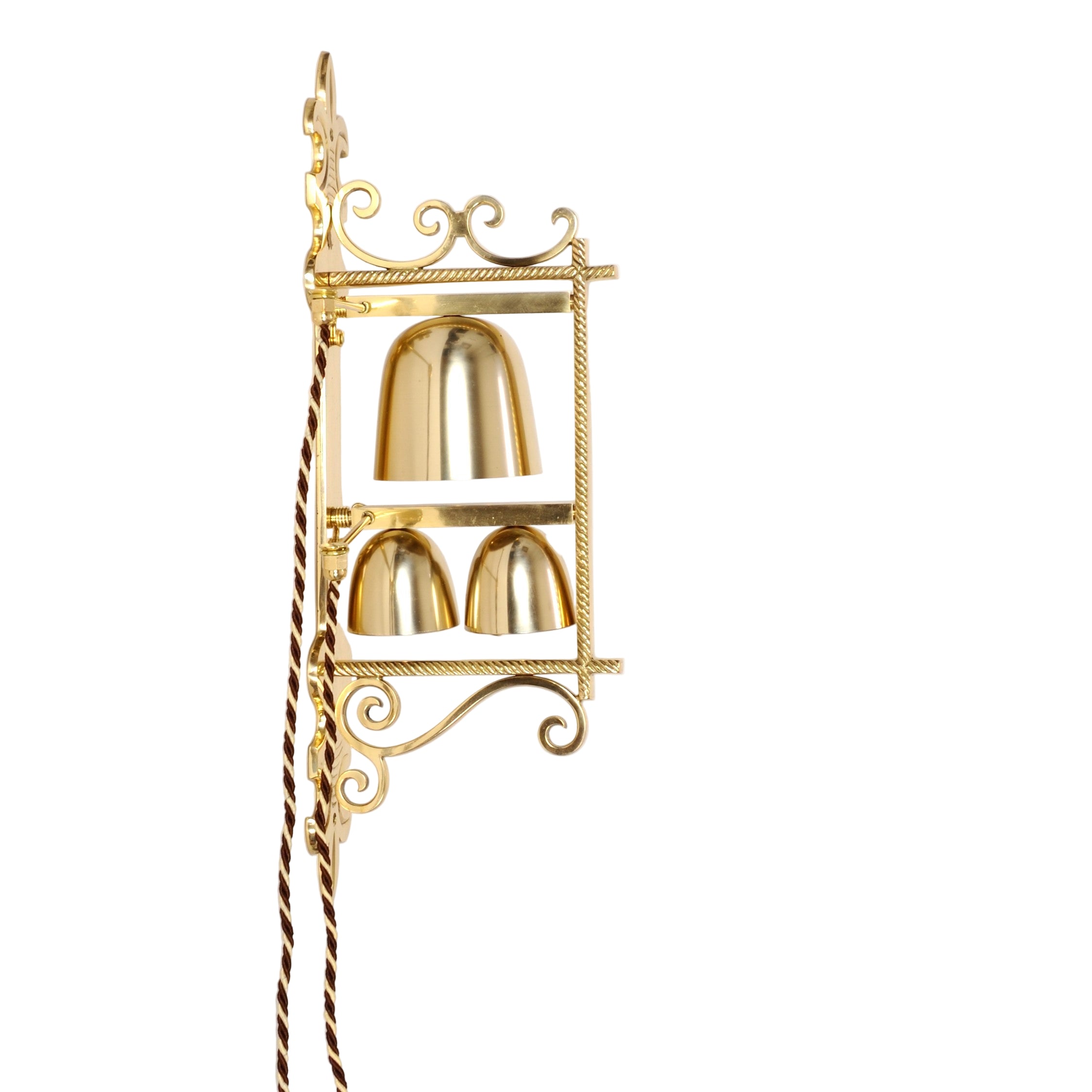 Triple Sanctus Wall Bell. Double cord to control your ring tones, One cord sounds the larger bell, One cord sounds the two smaller bells, Together all bells sound.