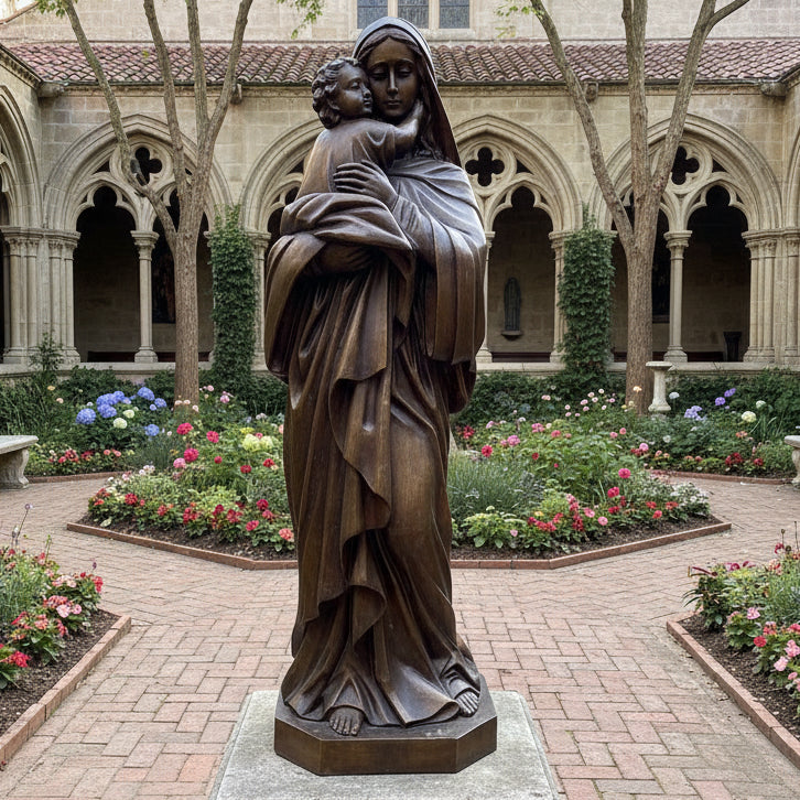 Outdoor bronze statue of Blessed Mother with Child