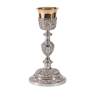 Item Information: This hand embossed chalice is executed in the Byzantine style. This all sterling silver chalice has a cup finished in 24kt. gold-plate.