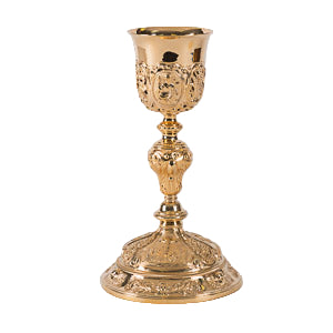 Item Information: This all sterling silver hand embossed Byzantine style chalice is finished in 24kt. gold-plate.