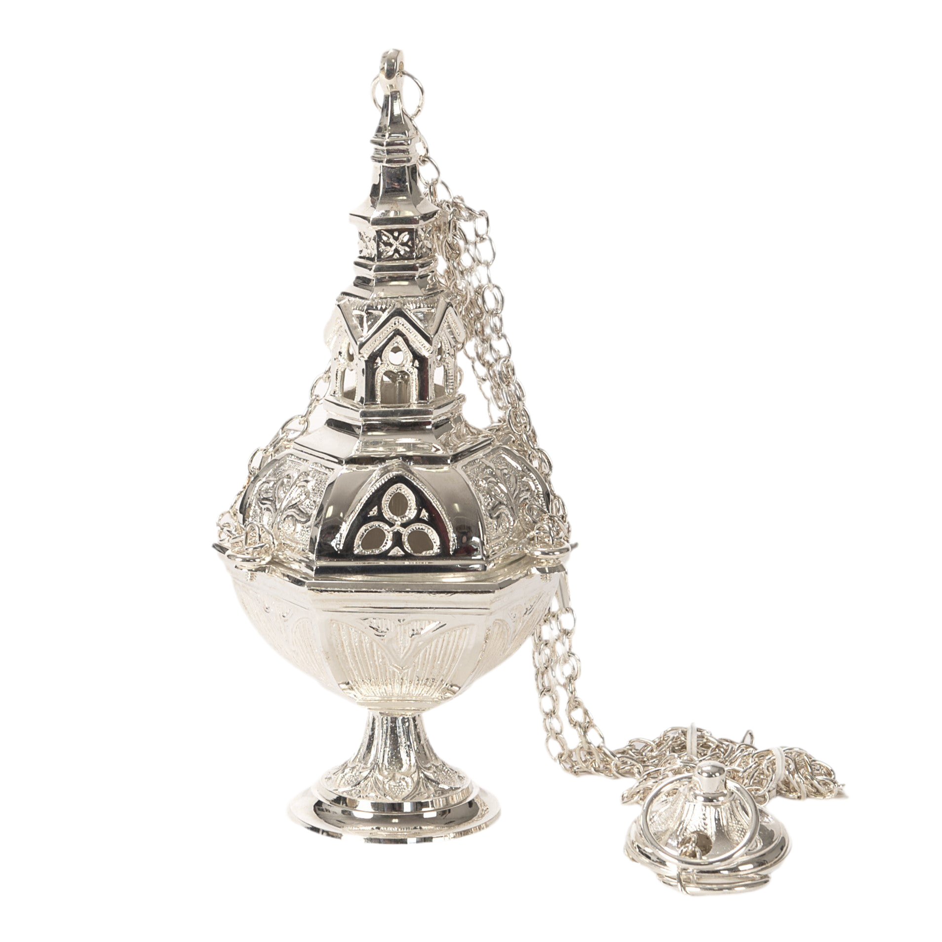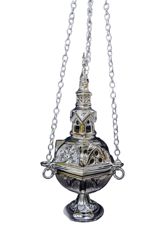 Silver plated traditional church censer with removable charcoal burn cup.
