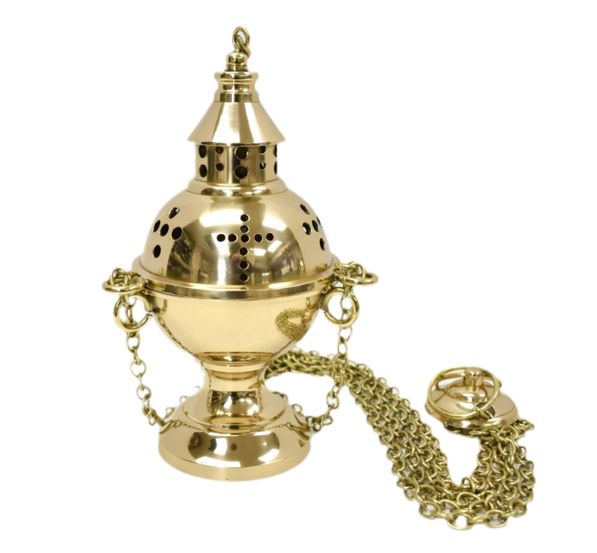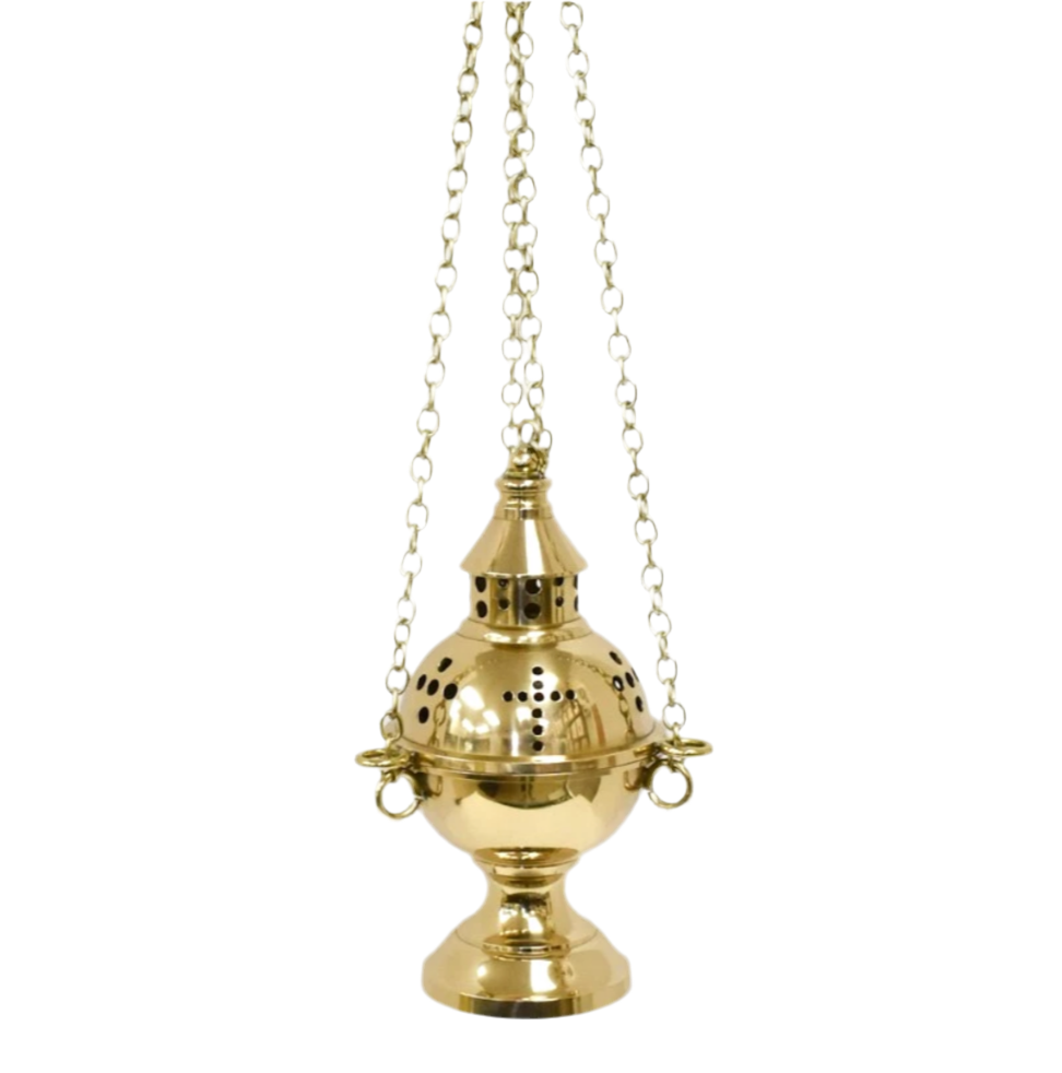 This brass censer is all polished and lacquered, has a removable inside liner to burn the coals in. Easy to clean. The total hanging height is 43". The censer itself measures 8 1/2" ht. and 4 1/2" diameter. Nice and sturdy, ready for years of use.