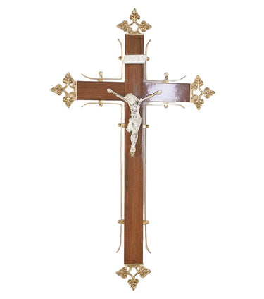 Wall hung Crucifix in wood and brass with silver plated small corpus and INRI.