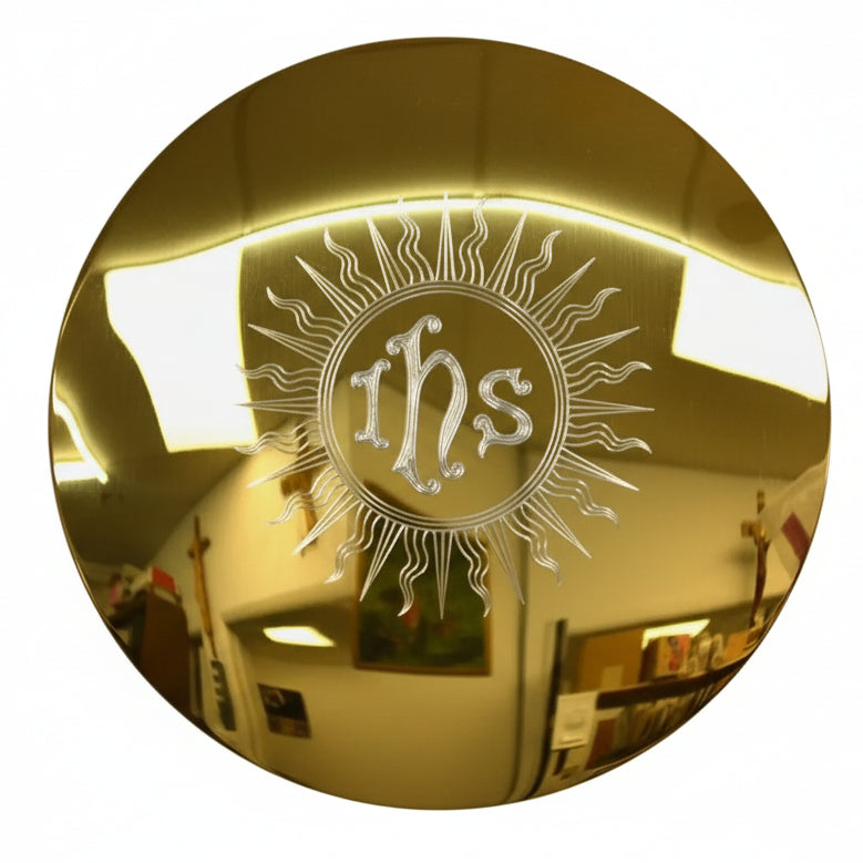 Sterling Silver and Gold Plated Disk Paten - IHS with Sunburst RaysSizes: 6" diameterAvailable Finishes: Goldplate