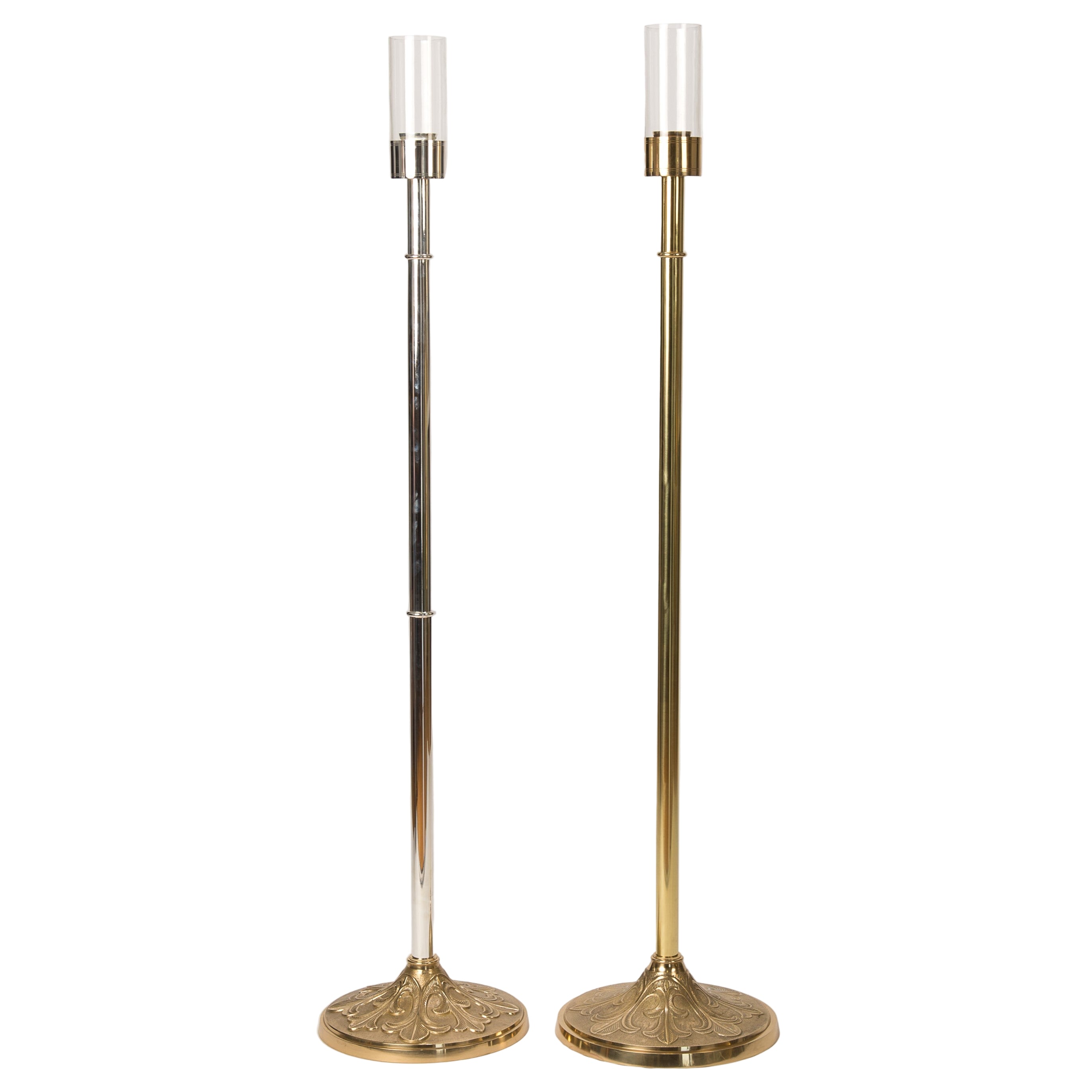 Glass enclosed processional candle stick and base stand set.