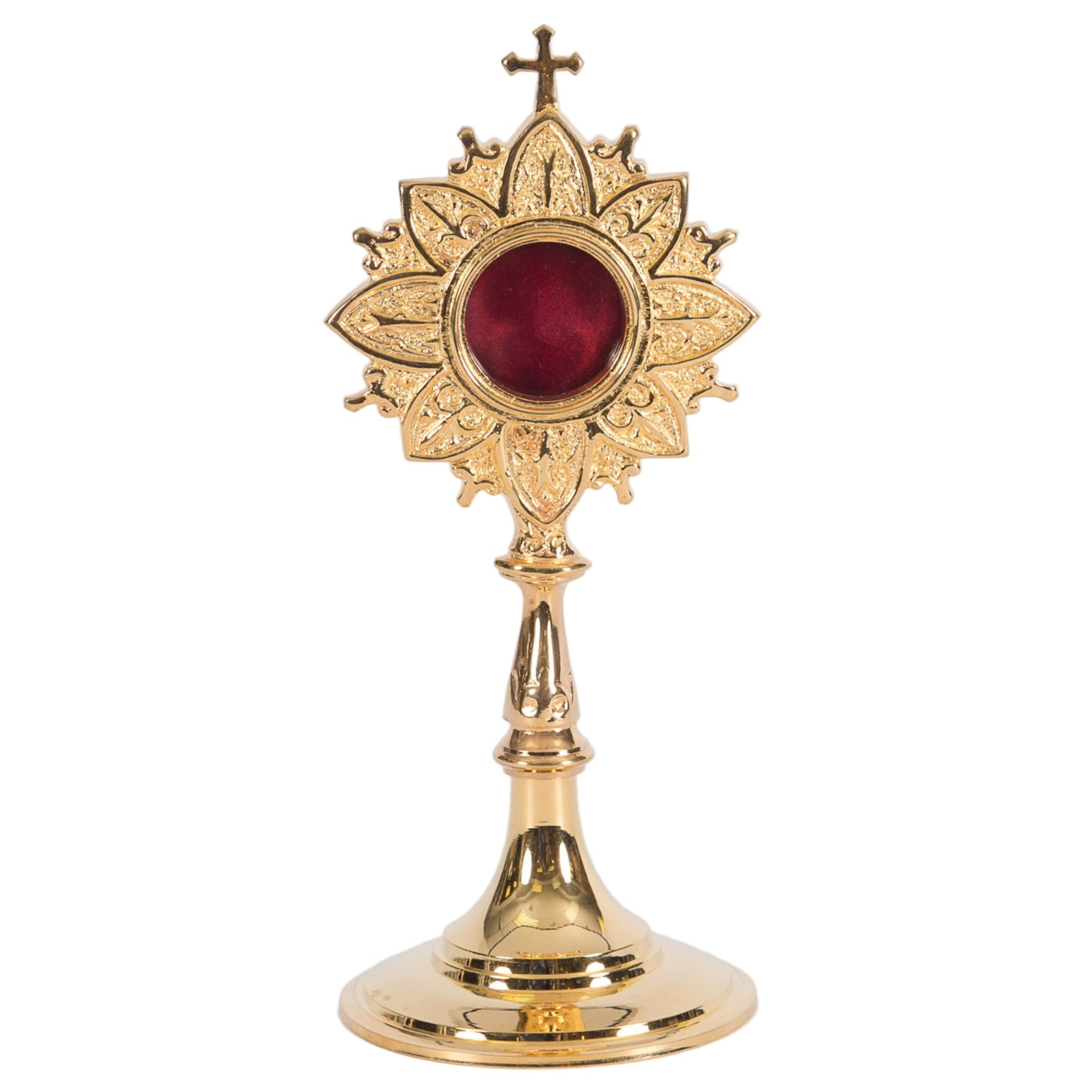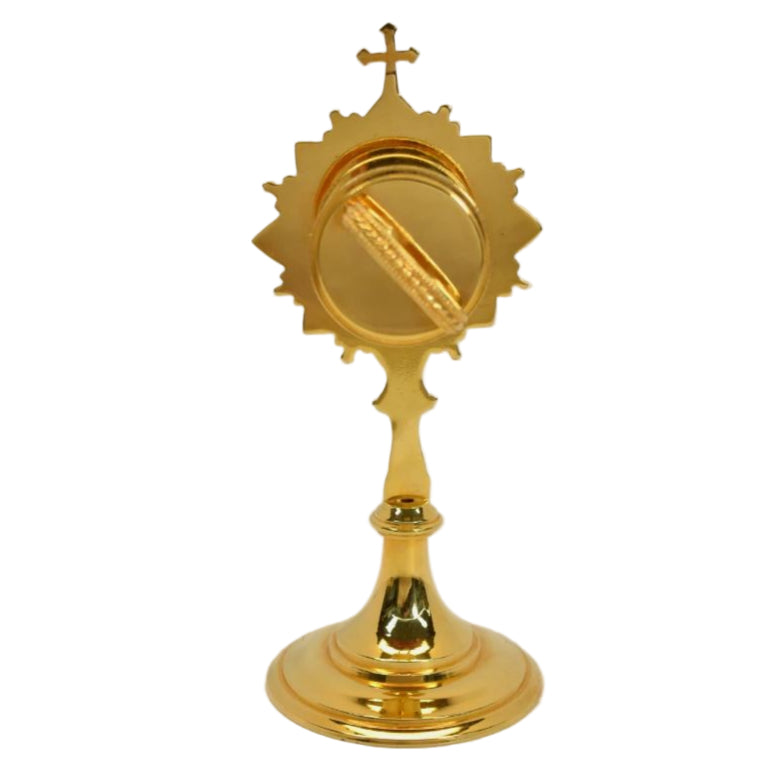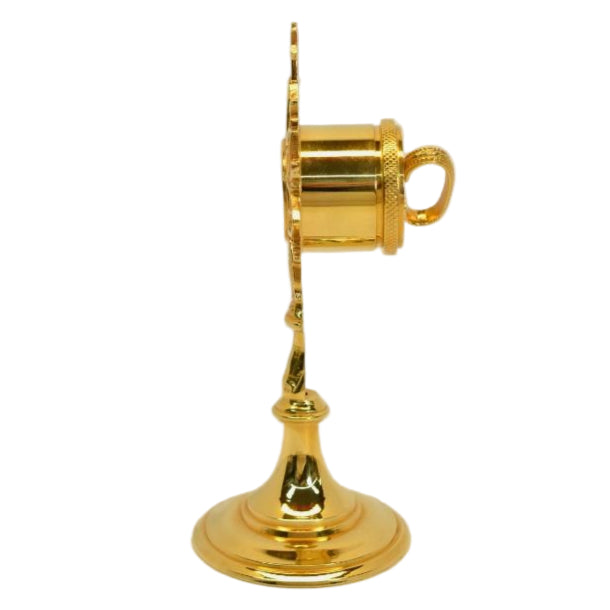 Traditional 7 3/4" Gold Plated Veneration Reliquary with a handle on back for easy display and presentation.