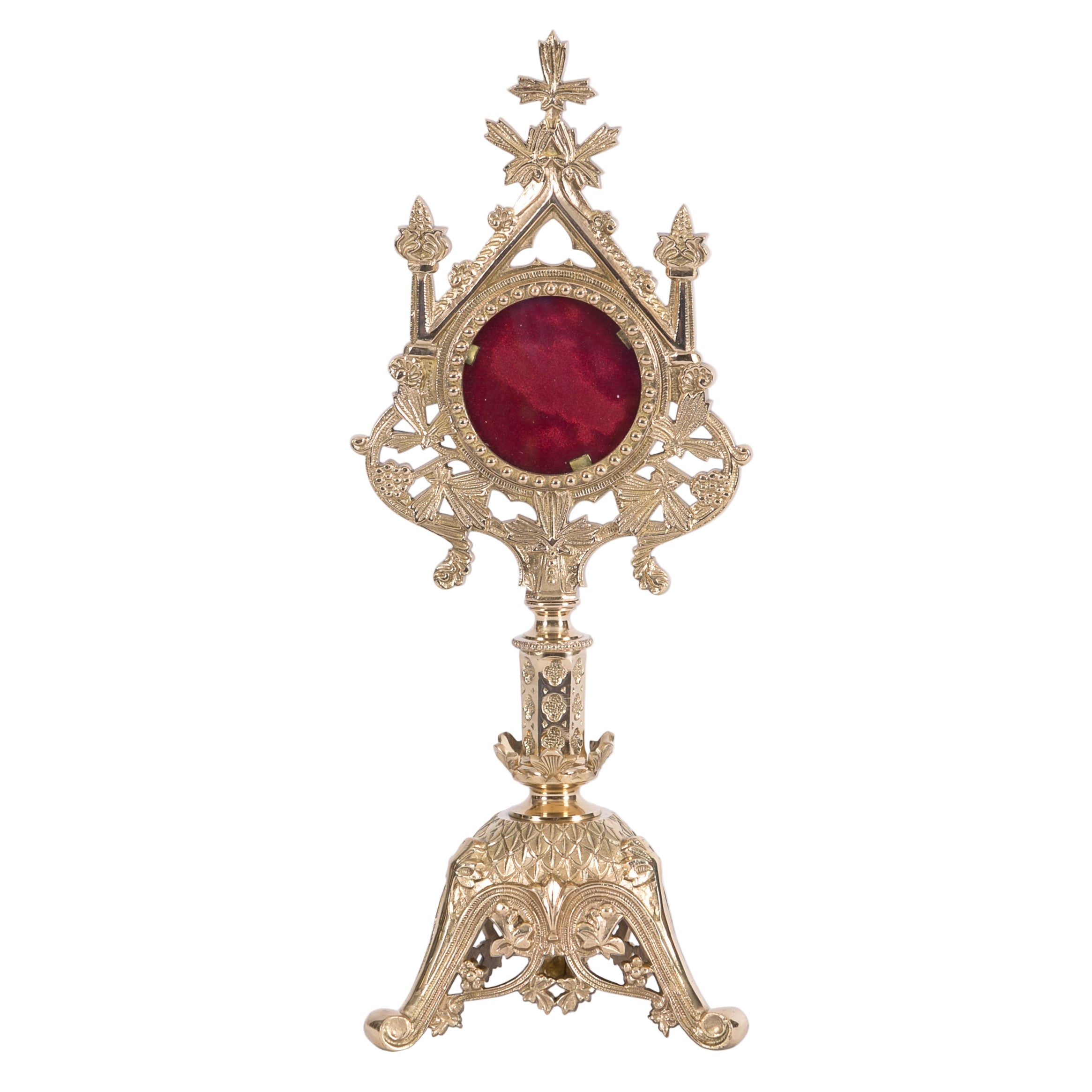 Front Glass View: 2 3/4" Round, Relic Compartment Inside: 3" round. 15 1/2" Ht, 6 1/4" W (Widest Point), 5 3/4" Triangular Base Sides