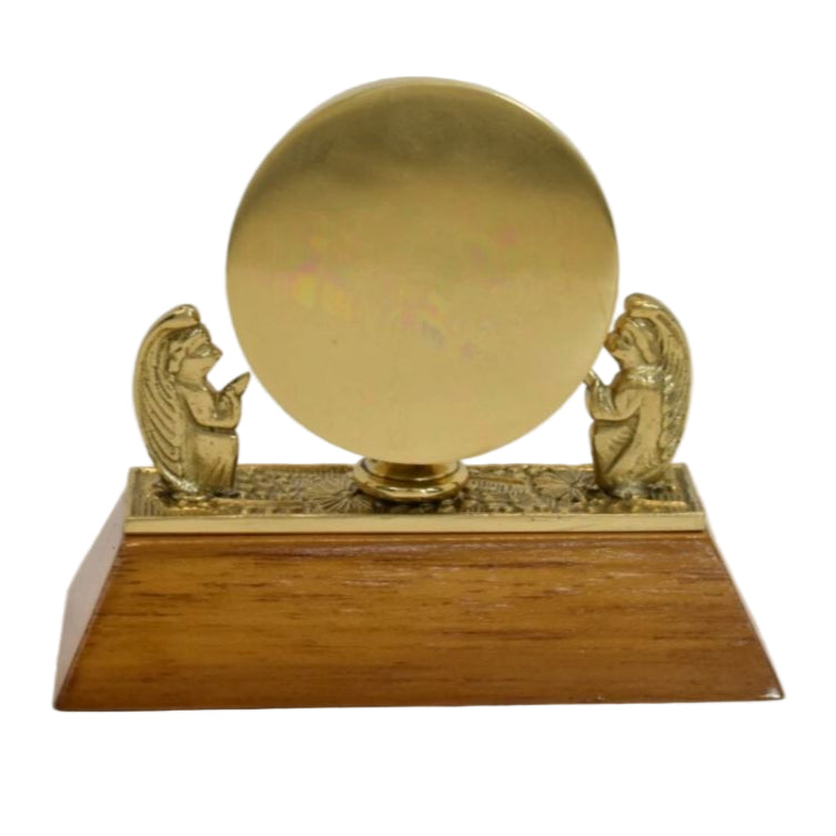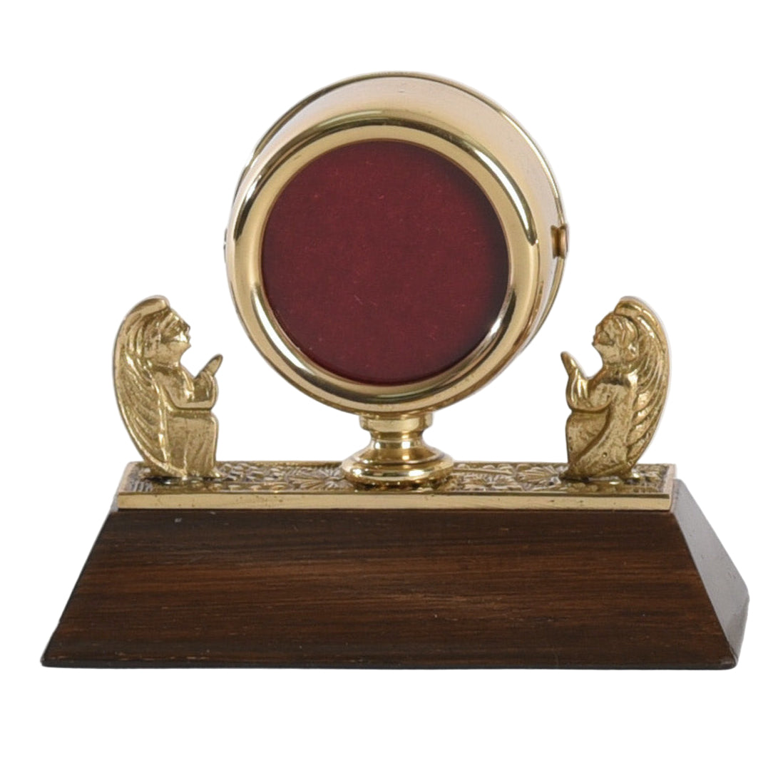Small brass angel reliquary with dark wood base.