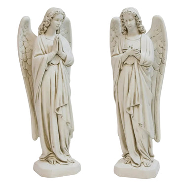 Pair of Fiberglass Angel Statues.25" tall. One with arms crossed, one with arms in prayer. Antique stone finish.