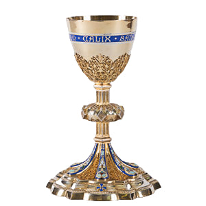 Sold only as a matching set, The pieces are created in all sterling silver and finished in pure 24kt. gold-plate. Each cup has an enamel text band on the cups, The ciborium lid and both bases are also decorated in artistic enamel panels.