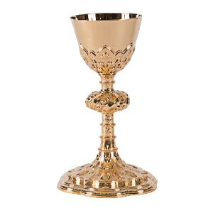 Amazing artistic detail is everywhere on this Flora IV chalice. Hand embossing and hand engraving at the highest level of craftsmanship. Created in all sterling silver and finished in pure 24kt. gold-plate. Simply a perfect example of gothic perfection.