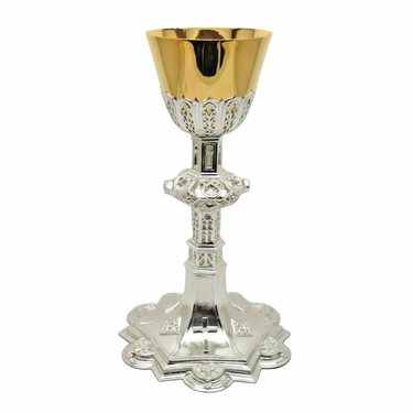 This chalice is all Sterling Silver with a 24kt. gold-plated cup.